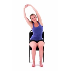 Side Bend - Sit upright in a chair with feet flat on the floor, hip-width apart, and shoulders relaxed. Clasp both hands together and reach them up above your head. Slowly bend your torso to one side, keeping your hips anchored and avoiding forward or backward tilting. Hold the stretch for 15-30 seconds, feeling a gentle pull along your side, then return to the center. Repeat on the other side.
