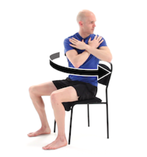 Sitting Spinal Twist - Sit upright on a chair with feet flat on the floor, hip-width apart, and shoulders relaxed. Cross your arms over your chest, placing each hand on the opposite shoulder. Slowly rotate your torso to one side, keeping your hips square and facing forward. Gently turn your head in the direction of the twist to deepen the stretch. Hold for 15-30 seconds, feeling a gentle stretch through your mid-back and sides, then return to the center. Repeat on the other side.